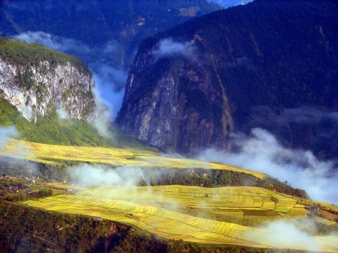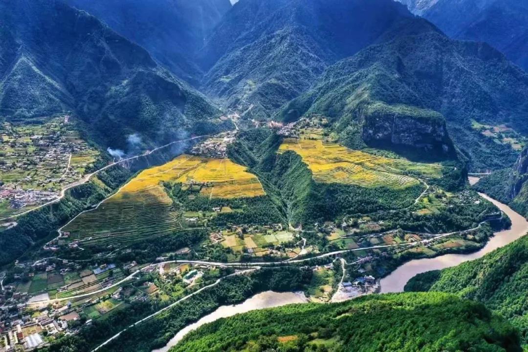 過了怒江第一灣,就到了丙中洛。站在觀景臺上,一邊是人神共居之地——丙中洛。另一邊是怒江上另一顆粉色寶石——桃花島。丙中洛鎮是一片比較平的坡地,四周被群山環抱,滿目蒼翠。放眼是美麗的田野風光。層層梯田一片金黃,阡陌田園之間,又是綠樹叢林相間。一彎怒江沿著大山邊緣,畫了個弧線流向右方,真是分不清楚是“蓬萊仙閣”還是“人間仙境”。