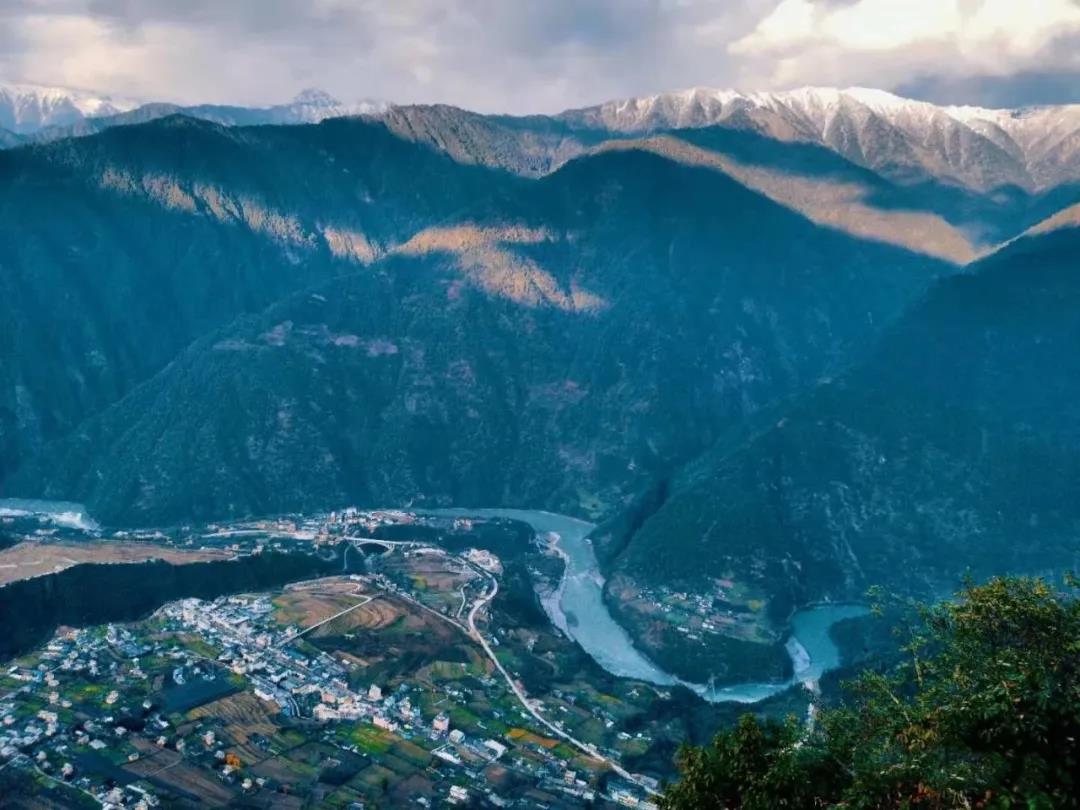 山路一轉,公路掙脫回環曲折,視線忽然變得開闊,仿佛突破了時空,一頭扎進了世外仙境。只見四面環山,一面向江,西高東低的山坡成片的農田,黑頂白墻泥屋悠閑地筑在田間,放眼往更高處眺望,遙遠的青巒雪山映襯著藍天白云。這就是世外桃源丙中洛,人神共居的天堂。