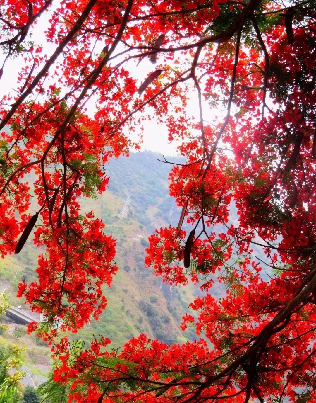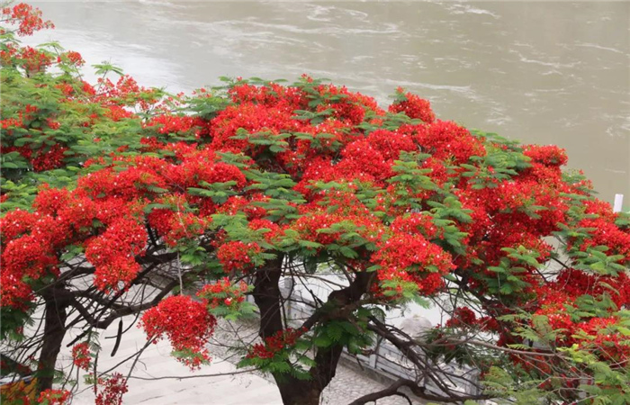 鳳凰木,又名紅花楹、鳳凰樹、金鳳、火鳳凰等,性喜高溫多濕的環境,必須在陽光充足處才能繁茂生長,花期一般為5月至7月,花開五瓣,因其葉如飛凰之羽,花若丹鳳之冠,故取名鳳凰花。