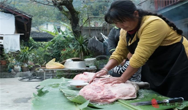 養殖足月的土豬,由農戶自給性的腌制,先是用磨盤輕輕擠壓剛宰下的豬腿,將肉中的血水擠出,再按照一定比例抹上怒江特有的“桃花鹽”,反復翻壓十五到三十天后,放于陰涼處晾。期間需要對其進行反復搓揉按壓,這樣既不破壞豬肉纖維 ,又能讓鹽分均勻滲入。