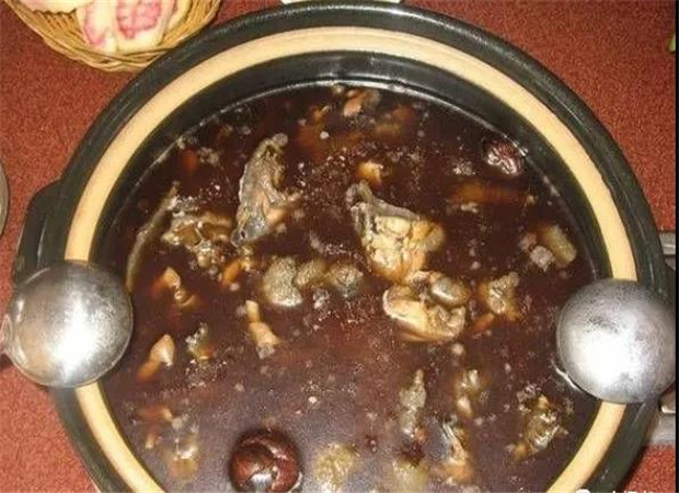 制法:把雞宰殺去毛,取出內臟,清洗干凈剁成塊。鍋上火燒熱,下漆油,至六成熱時下雞塊爆炒至雞塊呈金黃色,把雞肉和漆油倒入砂罐內,加鹽、蔥段、姜片、白酒,蓋上碗,碗內注入冷水,用面糊封嚴罐口,置于小火上燜兩小時即熟。