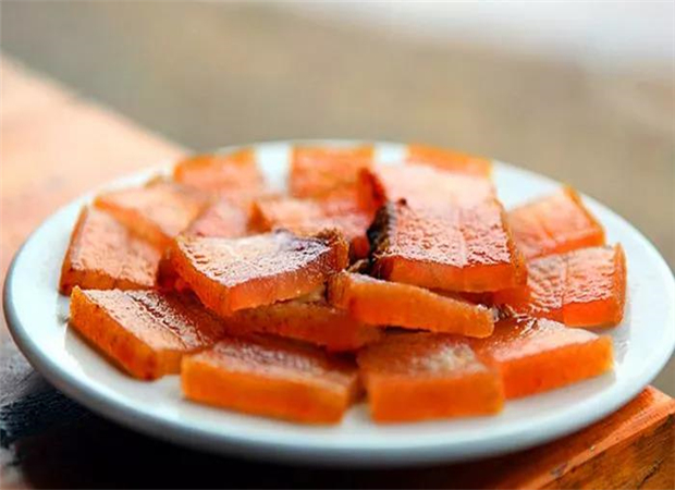 琵琶肉是一種用傳統腌制方法制作而成的肉品。具體方法是豬屠宰后將其內臟和骨頭取出,保留完整軀體。待其稍涼后,撒入花椒面、草果面、食鹽等佐料及白酒,輕輕搓揉后,將其開口縫合,在縫線部涂敷上水或香油調好的灶灰,并用木塞或玉米芯把豬鼻塞嚴,以防蟲蛀。然后用石板或木板壓上晾干,干后形似琵琶,故名“琵琶肉”。琵琶肉的制作歷史悠久,保存時間長,若不切開,三、四年不變味。琵琶肉肉色透明,色鮮味香,風味獨特。