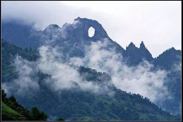 從遠(yuǎn)處眺望,透過(guò)石洞遙望山那邊明亮的天空,恰似一輪明月高懸于峰海山林之中,與天地融為一體,晝夜不落,有時(shí)日“月”同行,有時(shí)雙月媲美,其鬼斧神工,美倫美奐,令人嘆為觀止。