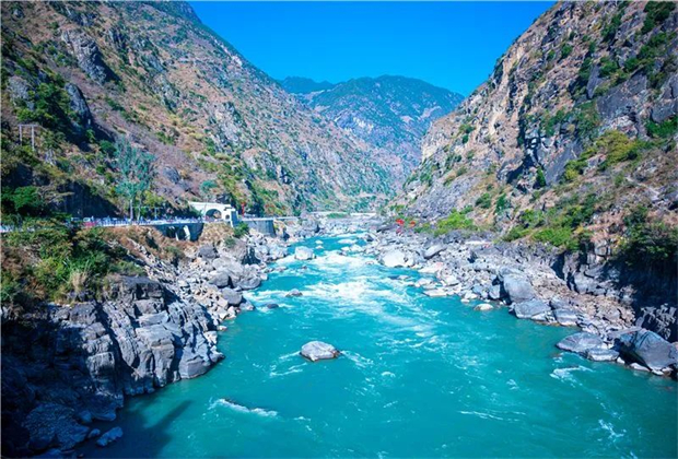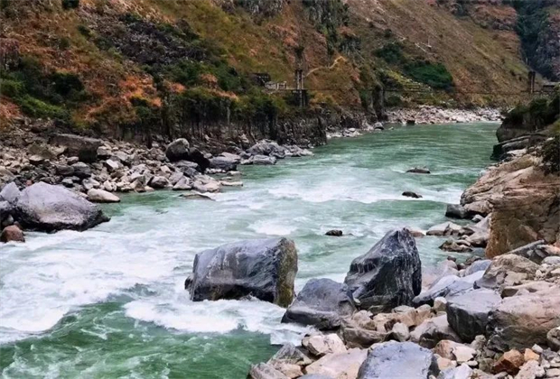 當一路狂奔而來的怒江水流經瀘水市稱桿鄉境,江中林立的怪石給江水設下障礙。江水在這里拍打又跌落,濺起浪花朵朵,轟鳴聲震耳欲聾,響徹山谷。這里因兩岸山嶺險峻,峰巒重疊,水流落差大,灘高水急,江面狹窄,遠看如猛虎下山,咆哮著撲向巨石,被稱為“老虎跳”。老虎跳被認為是怒江的天險,也是彰顯怒江個性的地標之一。來到怒江,當你看到“老虎跳”時,才能真正感受到其洶涌澎湃的氣勢。