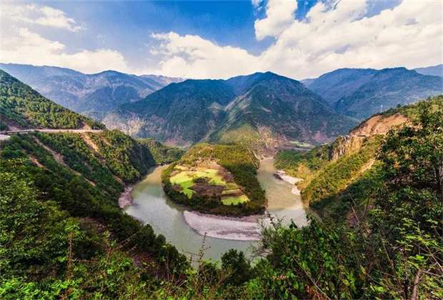 貢當(dāng)山上看怒江,是“怒江第一灣”,江水由北往南,流經(jīng)此處受大山阻隔,改為由東向西,流出300余米后,又被丹拉大山擋住去路,再次調(diào)頭由西向東急轉(zhuǎn),即形成了半圓形的大灣,被稱為“怒江第一灣”。氣勢磅礴,風(fēng)光旖旎,水勢緩慢,兩岸風(fēng)景獨好。桃花島