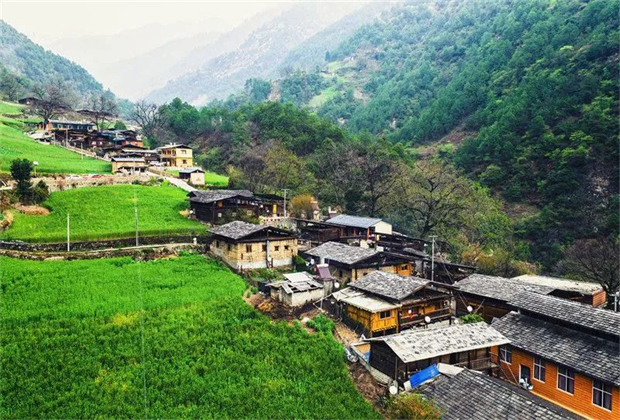 霧里村,是丙中洛往北去10公里的小村子,大片濃密的翠綠中,一座座高腳木樓(木楞房)錯落有致,樓頂?shù)那嗍逭凵渲疑墓狻G宄吭旗F繚繞,和著炊煙,仙境不過如此。茶馬古道