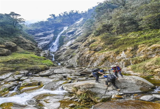 進入陰陽山后會發現,雖然外面驕陽似火,但一旦入谷,行走在參天大樹間就異常涼爽。陰陽山瀑布因瀑布分為兩股,分別由一座高山的陰坡和陽坡直落而下得名。兩條瀑布相距不到200米,越下懸崖后交融,陰陽相擁,注入怒江。瀑布下的懸崖奇峰陡峭,四周是蔥綠的原始森林,古木參天。更神奇的是不管季節如何變化,瀑布的水始終晶瑩透澈。