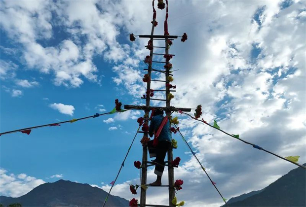 活動(dòng)在傈僳民歌“擺時(shí)”展示《歌唱幸福好時(shí)光》中拉開(kāi)序幕。嘉賓們參加了“吉祥神弩”啟弩儀式,見(jiàn)證傈僳人民歡度闊時(shí)節(jié)。活動(dòng)現(xiàn)場(chǎng),“刀桿祈福”表演將“祈福”儀式推向高潮,通過(guò)上刀桿“祈福”活動(dòng),為傈僳族同胞迎新祈福。