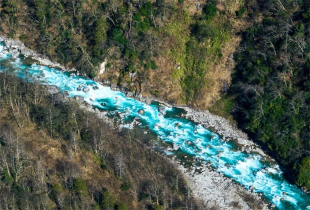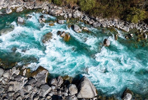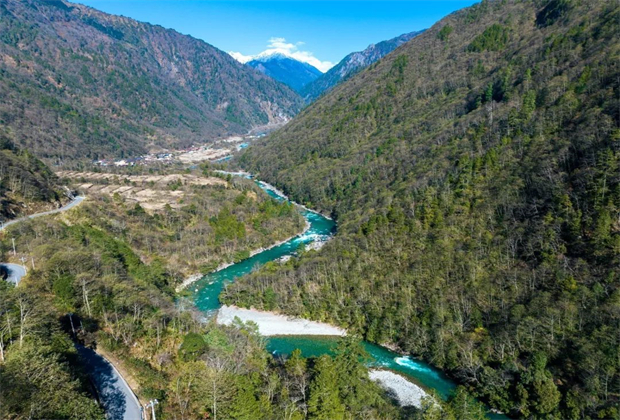 (碧綠獨龍江似一條玉帶蜿蜒山間。人民網 蔡樹菁攝)